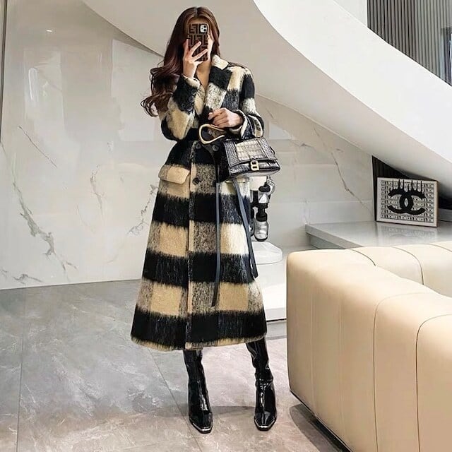 チェックウールロングコート